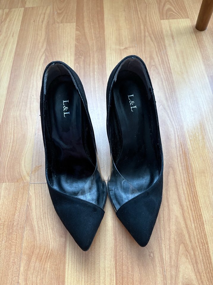 Siyah stiletto topuklu, minimalist goth tarzında, ofis için uygun kauçuk malzemeden yapılmış kadın ayakkabı.