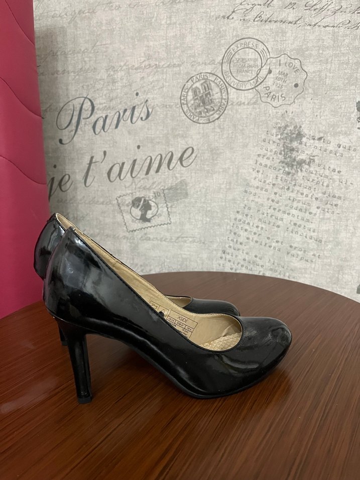Siyah, tokalı, kauçuk malzemeden yapılmış stiletto topuklu kadın ayakkabı. Klasik gotik tarzda, ofis kullanımı için uygundur. Koyu ve desensiz yapısıyla şıklık sunar.