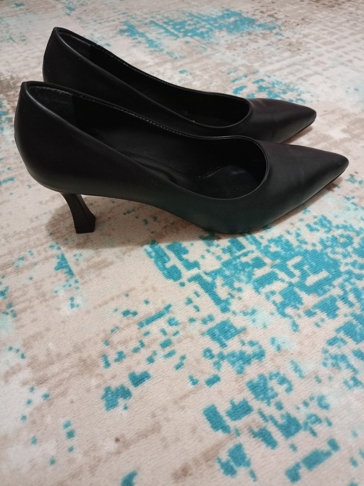 Siyah, sivri burunlu ve ince topuklu kauçuk stiletto. Klasik gotik tarzda, ofis kullanımı için uygun, zahmetsiz şıklık sunar. Desensiz tasarım. ucunda küçük soyunma var belli olmuyor giyince