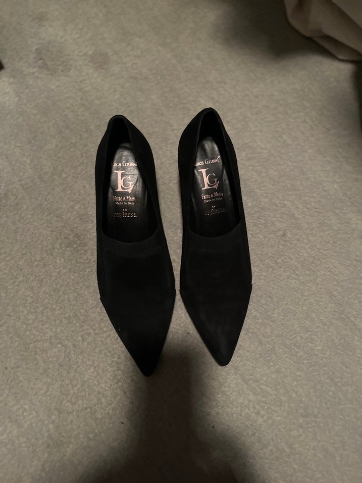 Siyah, sivri burunlu kadın topuklu ayakkabılar, kauçuk tabanlı ve desen içermeyen şık tasarıma sahip, ofis için uygundur. Divarese’den alınmış orjinal italyan marka luca grossi markadır.