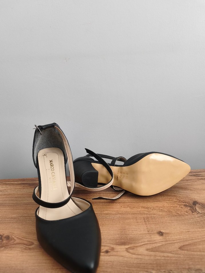 Siyah stiletto topuklu, düz kauçuk tabanlı, ofis için uygun, çağdaş ve zarif tasarımlı kadın ayakkabısı.