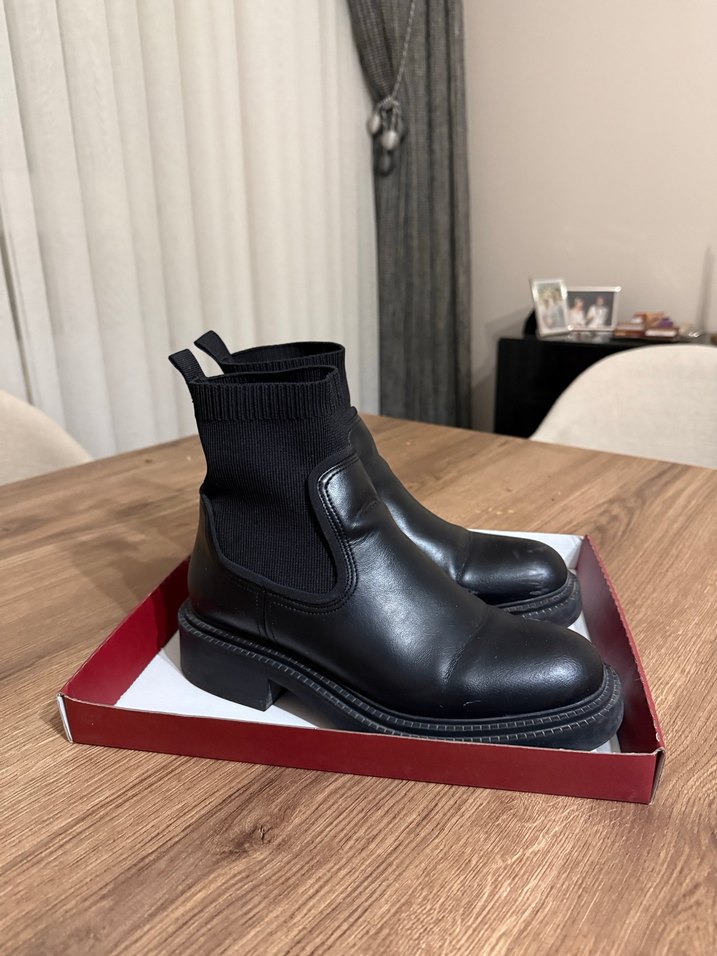 Siyah, lastik malzemeden kadın sokak botu. İnce topuklu, desen içermeyen ve esnek üst kısmı ile zahmetsiz şıklık sunar. Günlük, trend sokak tarzı için uygun. Kusuru/bozulması yoktur. Çok ayakkabım olduğu için satıyorum.
