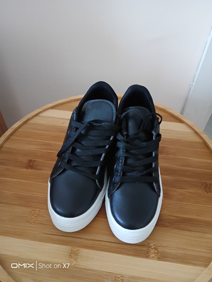 Siyah, stiletto topuklu kadın spor ayakkabısı, kauçuk tabanlı, desensiz ve şık tasarımlı, günlük kullanıma uygun rahat bir sokak stili.