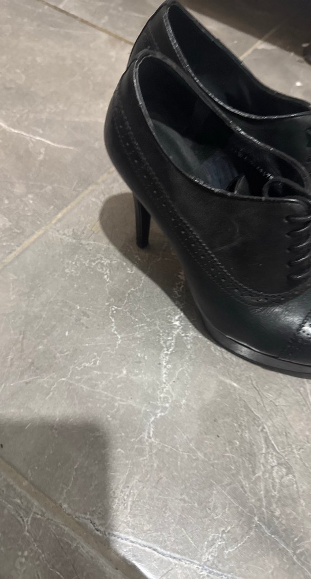 Siyah, lastik malzemeden yapılmış, stiletto topuklu ve tokalı klasik kadın ayakkabısı. Ofis kullanımı için uygundur ve gotik stil dokunuşu taşır.
