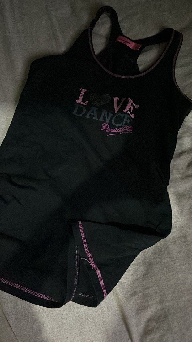 Dar kesim siyah atlet, straplez yaka ve elastik detaylıdır. "LOVE DANCE Pineapple" baskılı, sentetik kumaştan, sokak modasına uygun.