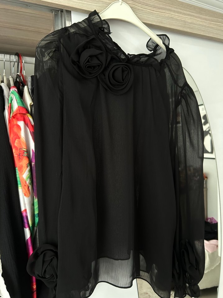 Siyah straplez bluzu bol kesim, fırfır ve çiçek detaylı