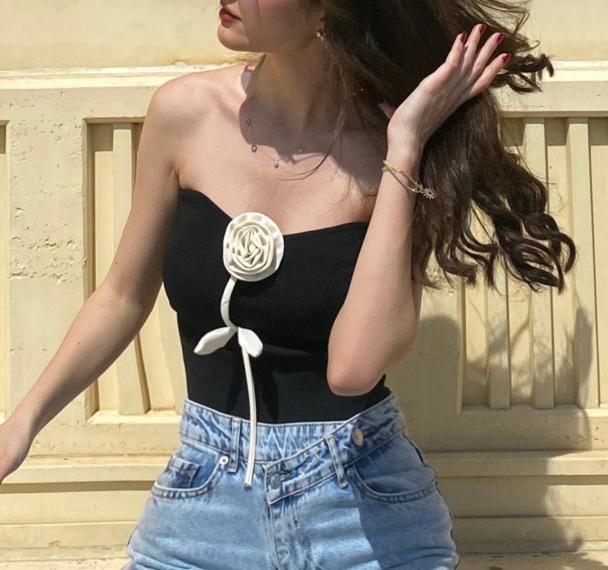 Siyah, straplez yakalı ve beyaz gül detaylı crop. Sokak stili için uygun. Az kullanılmış