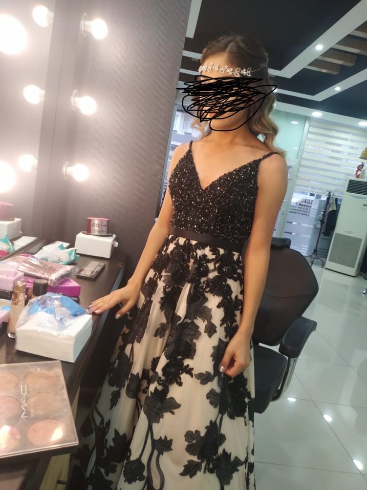 Siyah straplez, dantel işlemeli, uzun ve kolsuz, vücuda oturan abiye elbise. Düğünler için şık ve gotik tarzda uygun. 1 kere giyildi herkes bayıldı