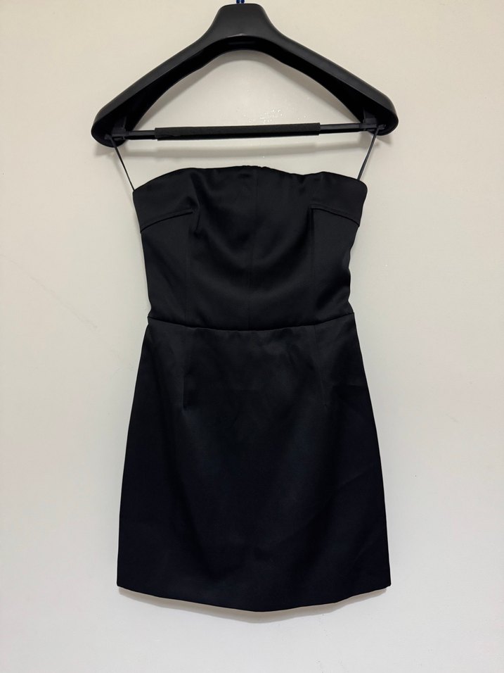 Siyah straplez mini elbise, saten dokulu ve drapeli tasarımıyla romantik gece için ideal. ✨