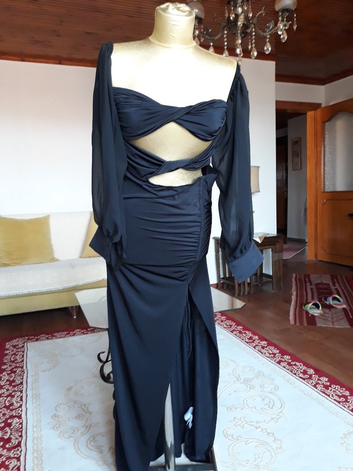 Drapeli detaylara, straplez yakaya ve askılı kollara sahip siyah, vücuda oturan uzun abiye elbise, avant-garde parti stiline uygundur.