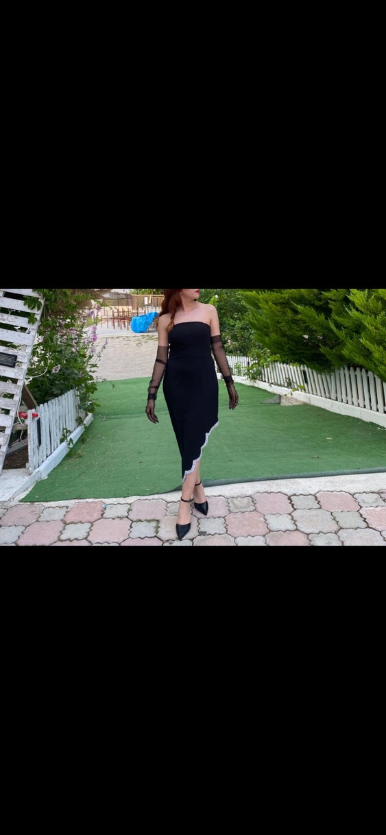 Siyah straplez, drapeli ve askılı kollu bu dar kesim elbise. Pürüzsüz sentetik kumaştan üretilmiştir. Eldivenleriyle beraber göndereceğim marka temsili