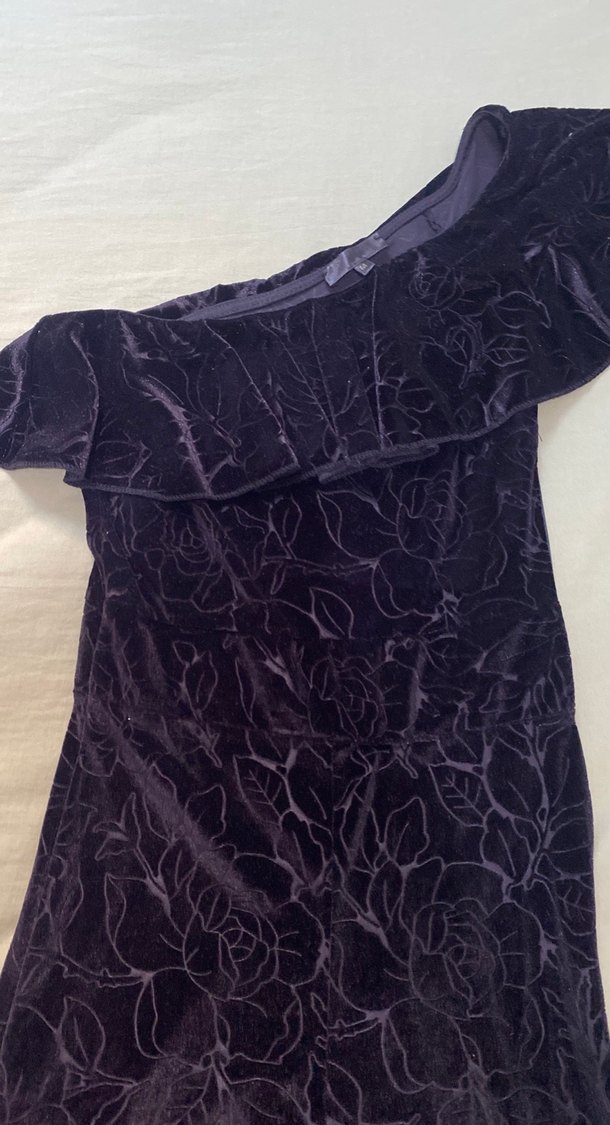 Siyah straplez, drapeli kısa kollu, vücuda oturan uzun tulum . Hafif çiçek desenli dokusu ile romantik akşamlar için uygun.