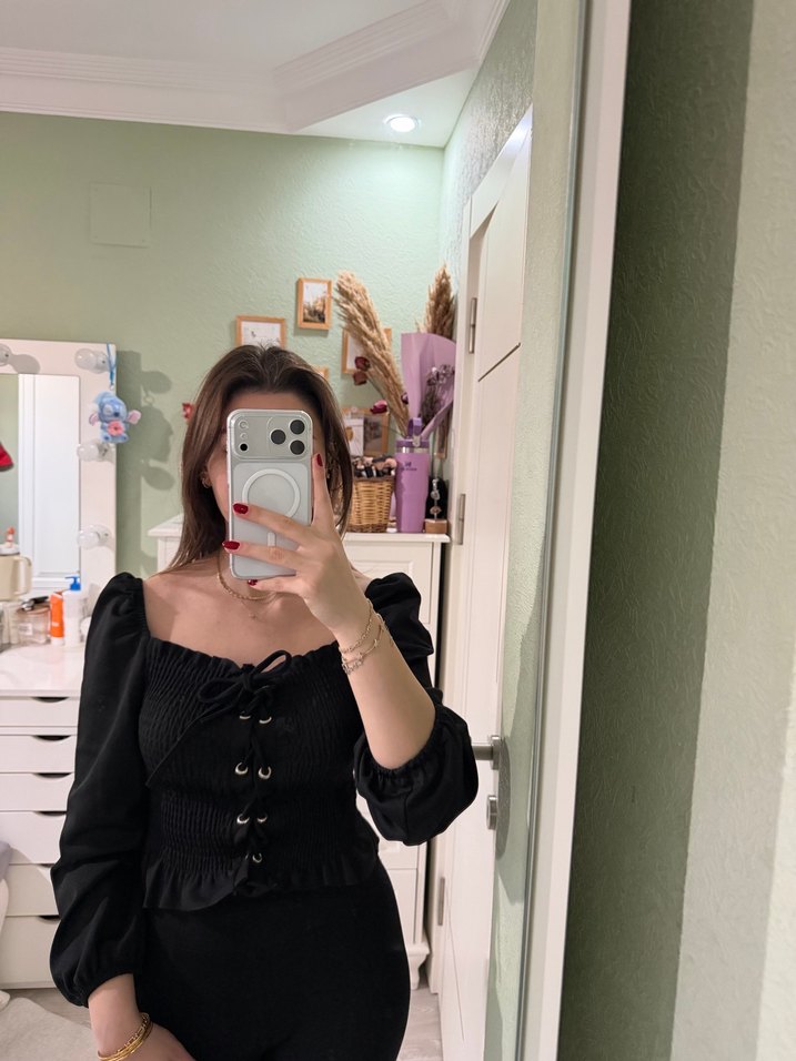 Siyah straplez yaka, uzun kollu ve düğmeli detaylara sahip, sentetik kumaştan üretilmiş gotik tarzda dar kesim kadın bluz.