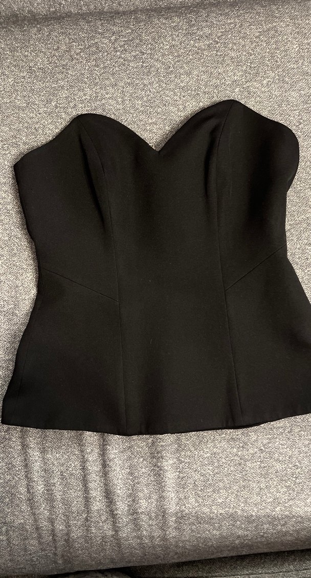 Fermuarlı , straplez yakalı ve dar kesimli siyah büstiyer, yumuşak sentetik kumaştan üretilmiştir. Midi boyu ve minimalist gotik tarzıyla ofis kullanımı için uygundur.