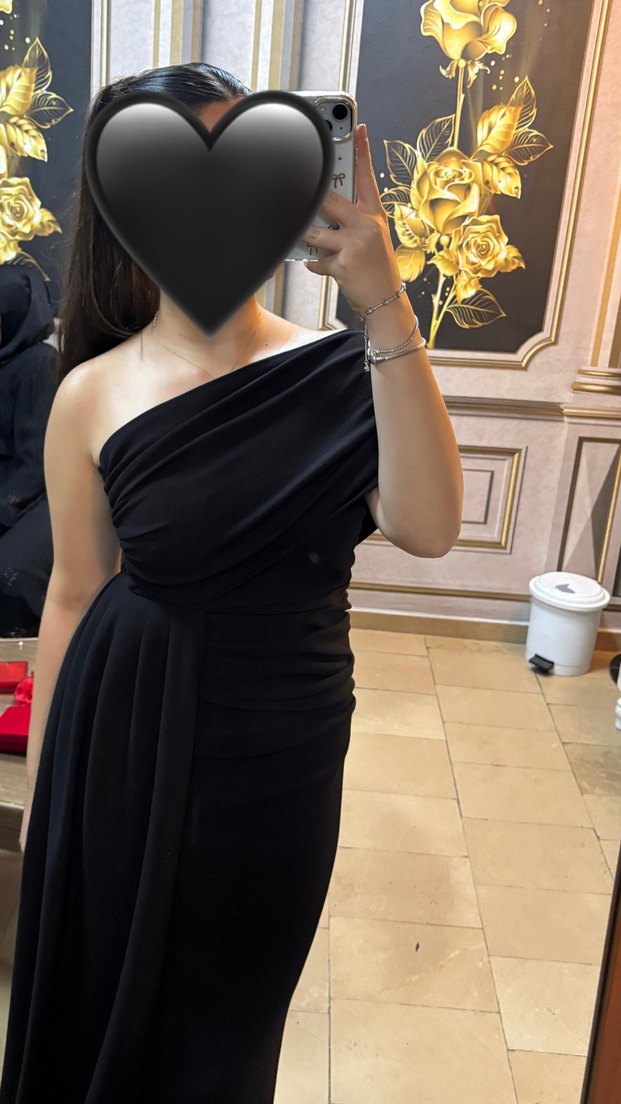 Bu siyah midi elbise, drapeli straplez yakası ve askılı kol detayıyla dikkat çeker, gösterişli partiler için uygundur. 1 kere giyildi