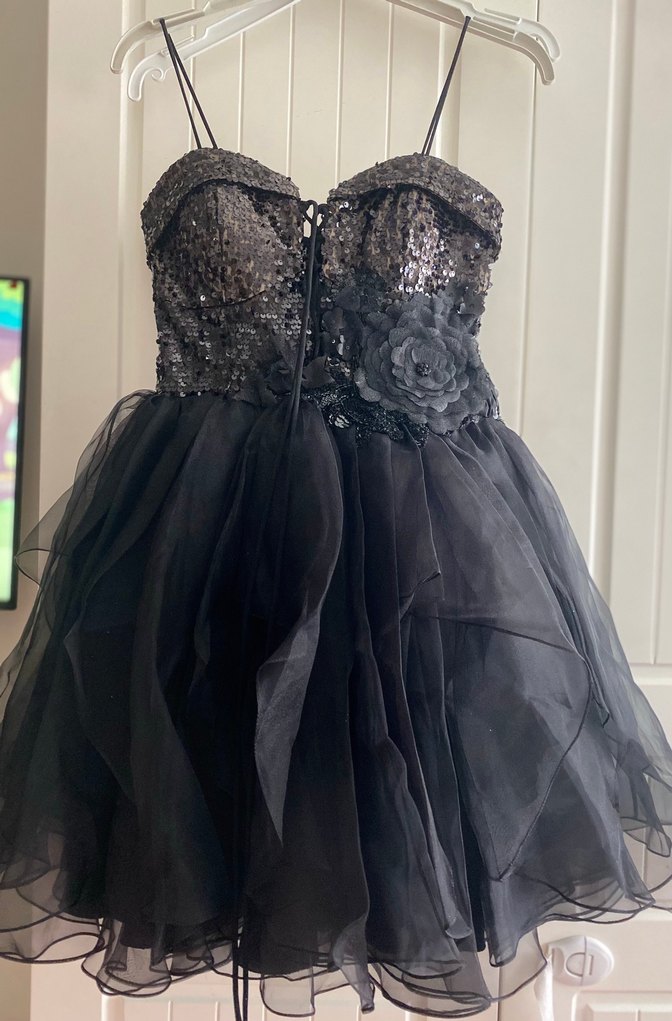 Siyah, straplez ve payetli gövdesi ile fitted kesim abiye elbise. İp askılı ve fırfırlı mini etek ile gotik tarzı özel tasarım yalnız bir defa giyildi.