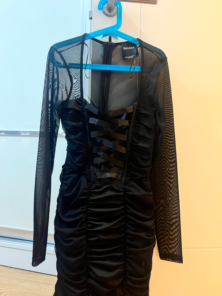 Dar kesim siyah gece elbisesi, straplez yaka, askılı detaylar ve pileli tasarımla, şeffaf uzun kollu, gotik tarzda parti için uygun.
