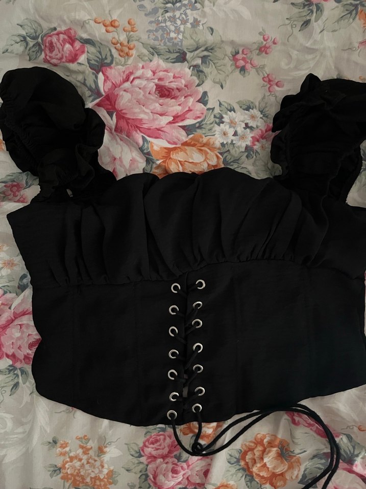 Siyah straplez, işlemeli detaylı, volanlı ve bağcıklı gotik bluz. Sentetik kumaştan, dar kesim ve normal boyda. Bedenme olarak görünüyor ancak bence S bedene daha uygun bir üst.