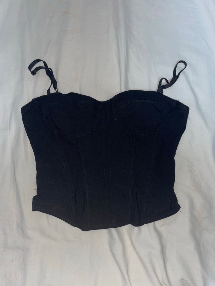 Siyah, straplez yakalı ve ince askılı, sentetik kumaştan yapılmış, gotik tarzda, midi boy, dış mekan kullanımı için uygun dar kesim büstiyer.