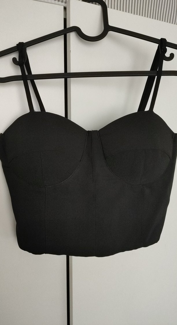 Siyah, straplez yaka ve ince askılı, sentetik kumaştan yapılmış fitted bustiyer. Gotik tarzda, romantik akşamlar için zahmetsiz şıklık sunar.