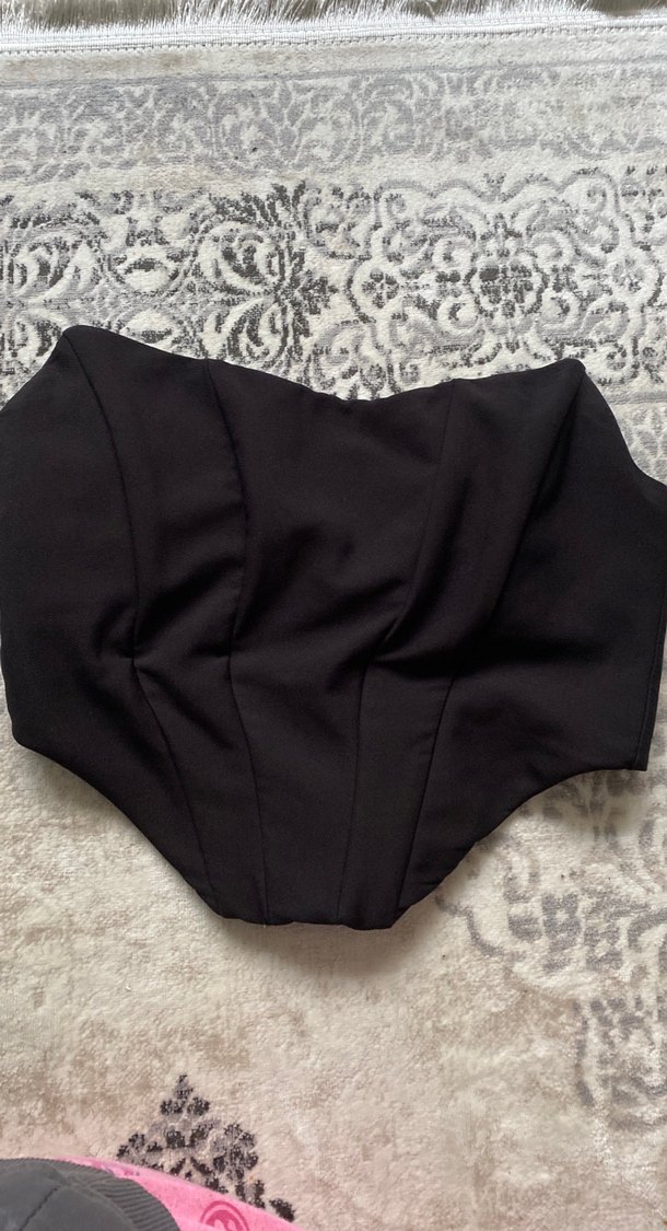 Siyah straplez, gotik tarzda, sentetik kumaştan yapılmış, vücuda oturan bustiyer. İnce askılı ve midi boyda, şık bir görünüm sağlar.