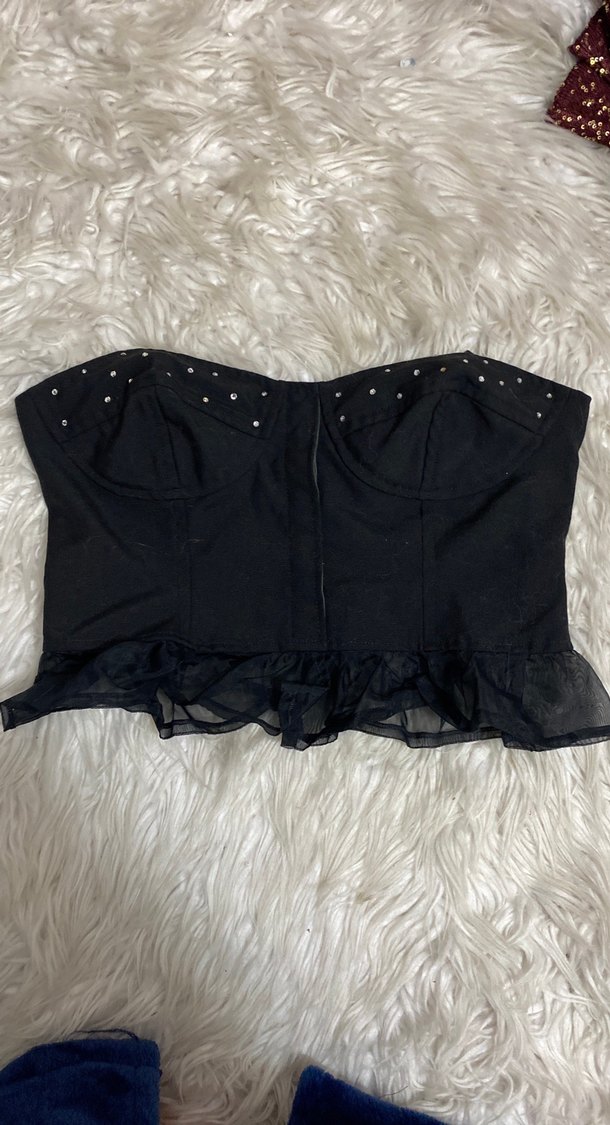 Siyah straplez, oturan kesim, fırfır detaylı ve taş süslemeli gotik tarzda büstiyer. Göğüs:86 bel:74 boy:28 cm