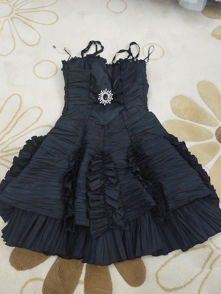 Siyah, straplez ve askılı bu fitted midi elbise, ruffle detaylarıyla gotik ve şık bir parti görünümü sunar. ✨