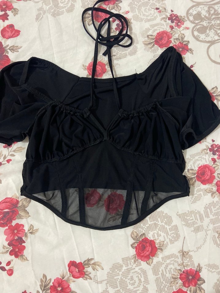 Siyah straplez, askılı kollu ve fırfırlı gotik mini bluz, sentetik kumaştan üretilmiştir. Vücuda oturan kesimiyle günlük kullanıma uygundur.