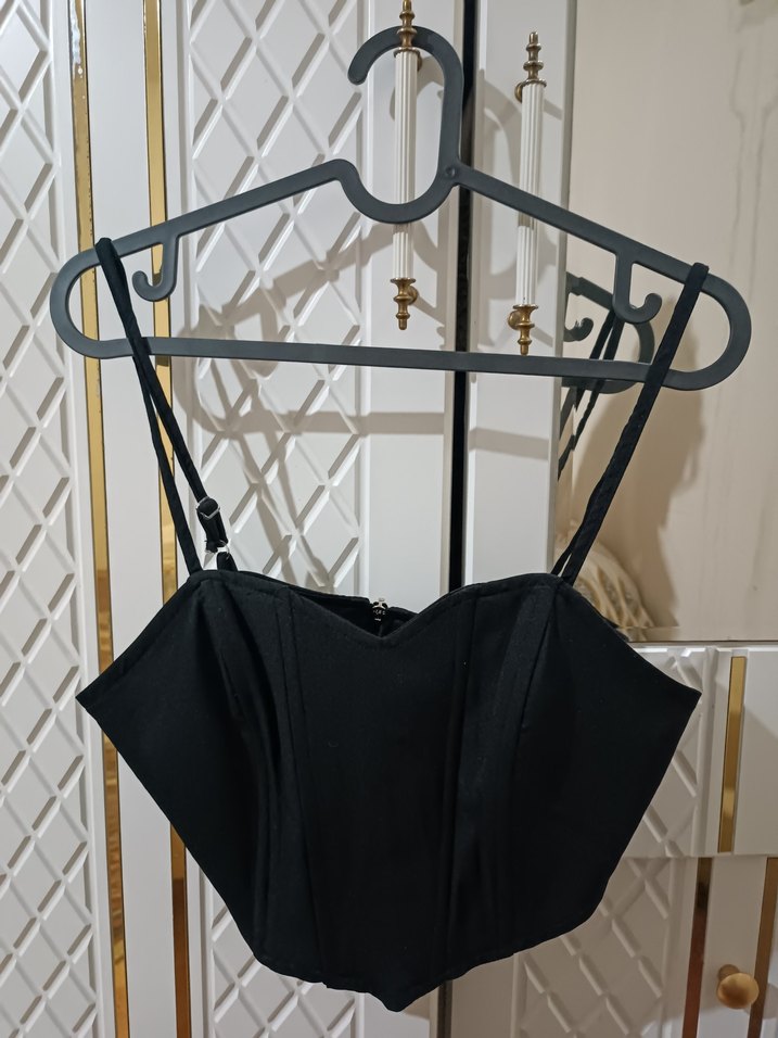 Siyah renkli, kayışlı ve tokalı detaylı, sentetik kumaştan yapılmış dar kesim gotik mini büstiyer. Günlük kullanıma uygun şık parça.
