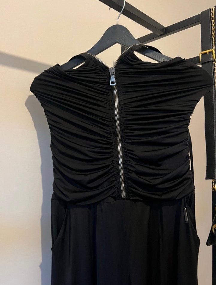 Bu siyah, straplez, uzun ve vücuda oturan elbise, önünde fermuar ve ince askılarla gotik tarzda romantik akşamlar için uygundur.