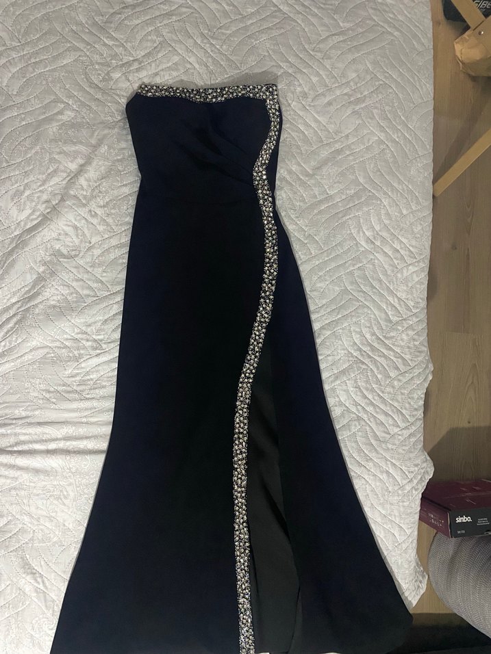 Siyah, straplez, uzun ve drapeli bu abiye elbise, yan tarafında işlemeli detaylara sahiptir ve şık bir görünüm sunar. Derin yırtmaca sahiptir.