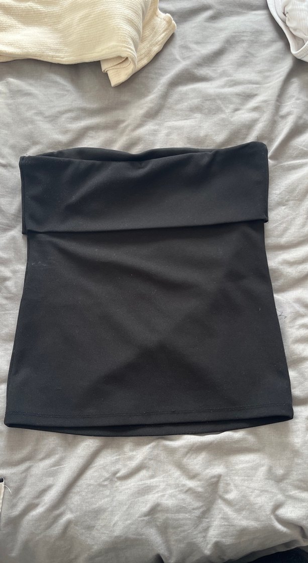 Düz siyah, straplez ve kolsuz kadın bustiyer. Sıkı oturan ve midi boyda, yumuşak sentetik kumaştan üretilmiştir. Minimalist sokak stili için uygundur. ✨