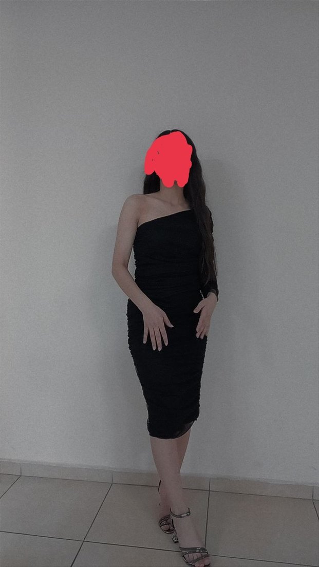 Siyah, straplez yaka ve ince askılı, drapeli detaylı, vücuda oturan midi elbise. Cesur ve minimalist gotik tarz için uygundur.Sadece bir kez giyildi...