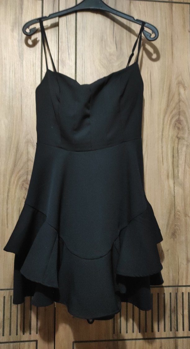 Siyah straplez midi elbise, fitted kesim ve volan detaylarıyla gotik parti stilini yansıtıyor. Kolsuz tasarım, avant-garde havası katıyor. göğüs kısmında kendi süngeri var çok güzel bir elbise mezuniyetimde bir kere giymistim