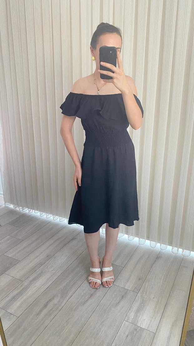 Siyah midi elbise, straplez yaka ve volanlı askılı kollara sahip. Rahat kesimi ve yumuşak sentetik kumaşıyla günlük kullanıma uygundur.