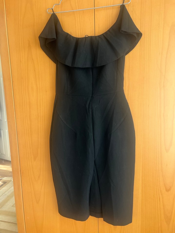 Siyah, straplez yaka ve fırfırlı detaylı, dar kesim midi elbise. Kolsuz ve minimalist gotik tarzda, ofis kullanımı için uygun.