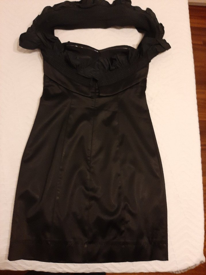 Siyah straplez,abiye elbise, vücuda oturan kesim ve fırfır detaylara sahip. Romantik akşamlar için uygundur. Kolsuz ve desensiz.