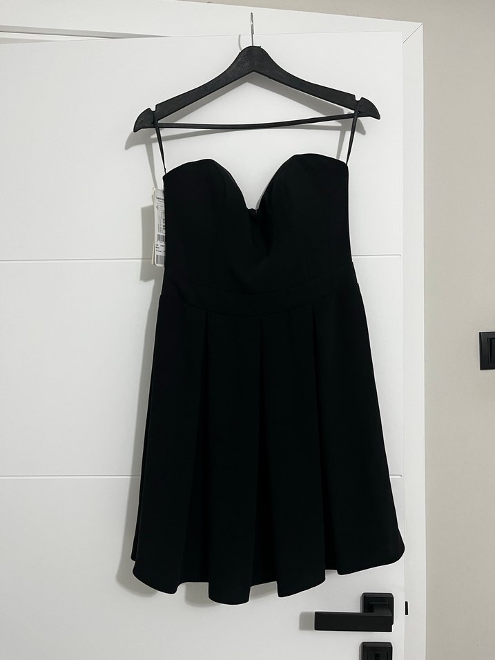 Siyah straplez midi elbise, oturan beden ve pileli detaylarıyla gotik tarzı yansıtıyor, romantik akşamlar için ideal.