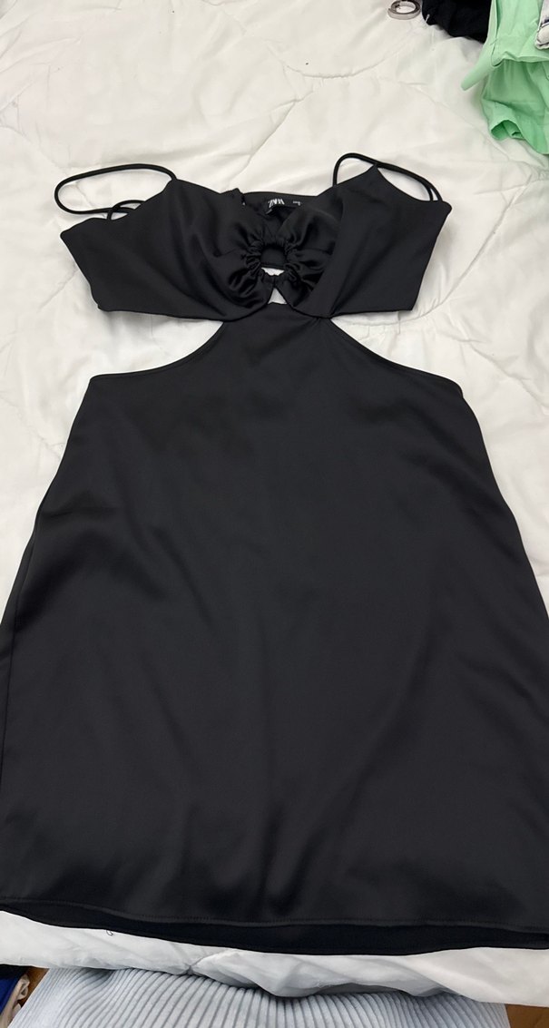 Bu siyah midi elbise, straplez yakası ve ince askılarıyla fit kesim sunar. Drapeli detayları ve minimalist gotik tarzı romantik akşamlar için uygundur. Şok fiyata xxs olur