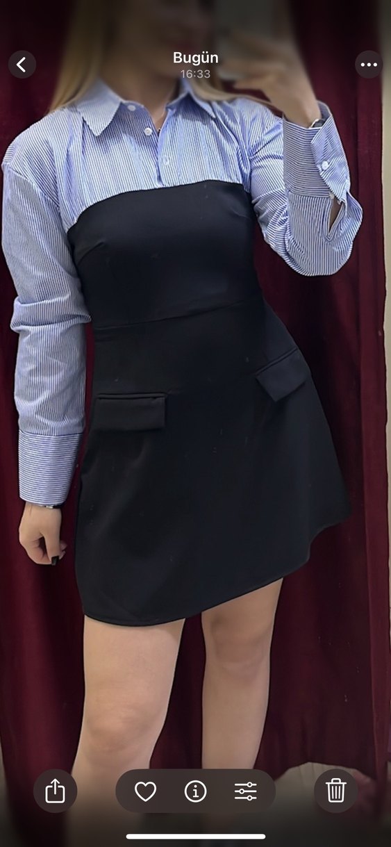 Siyah midi elbise, straplez ve düğmeli detaylara sahiptir. Sentetik kumaştan üretilmiş olup, ofis için uygun iş ve sokak stili karışımıdır. 2 defa giyildi