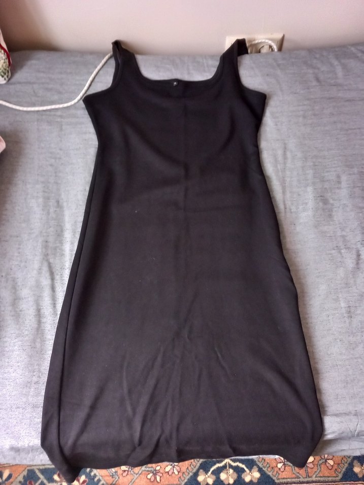 Siyah, straplez, midi boy, drapeli ve vücuda oturan triko elbise, günlük kullanım için uygundur.