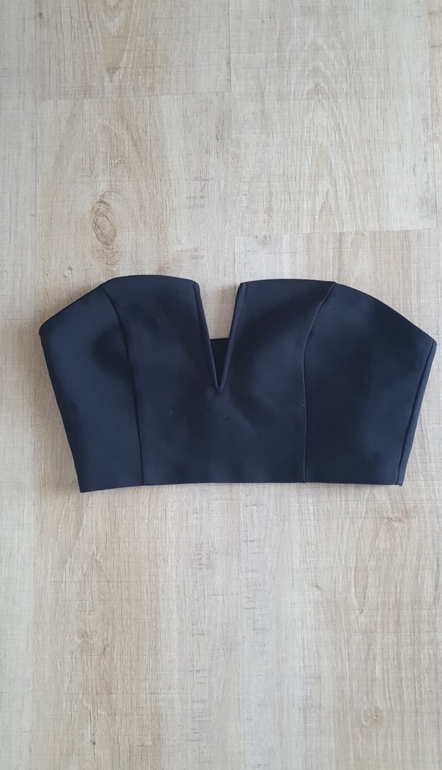 Siyah, straplez ve kısa kesim olan bu büstiyer, V yaka detayı ve kolsuz yapısıyla modern bir görünüm sunar. Sentetik kumaşıyla şık ve rahat bir tercih, romantik akşamlar için ideal.