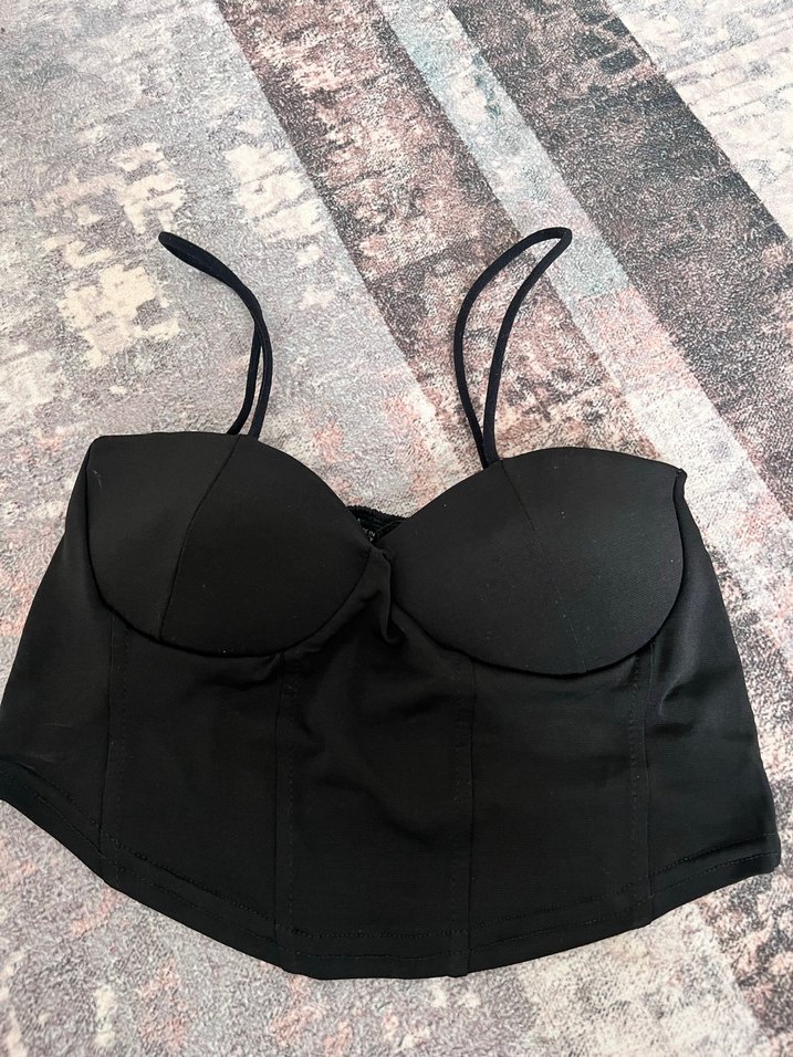 Siyah,straplez yaka ve ince askılı mini büstiyer. Pürüzsüz sentetik kumaştan, cesur gotik tarz için uygun.