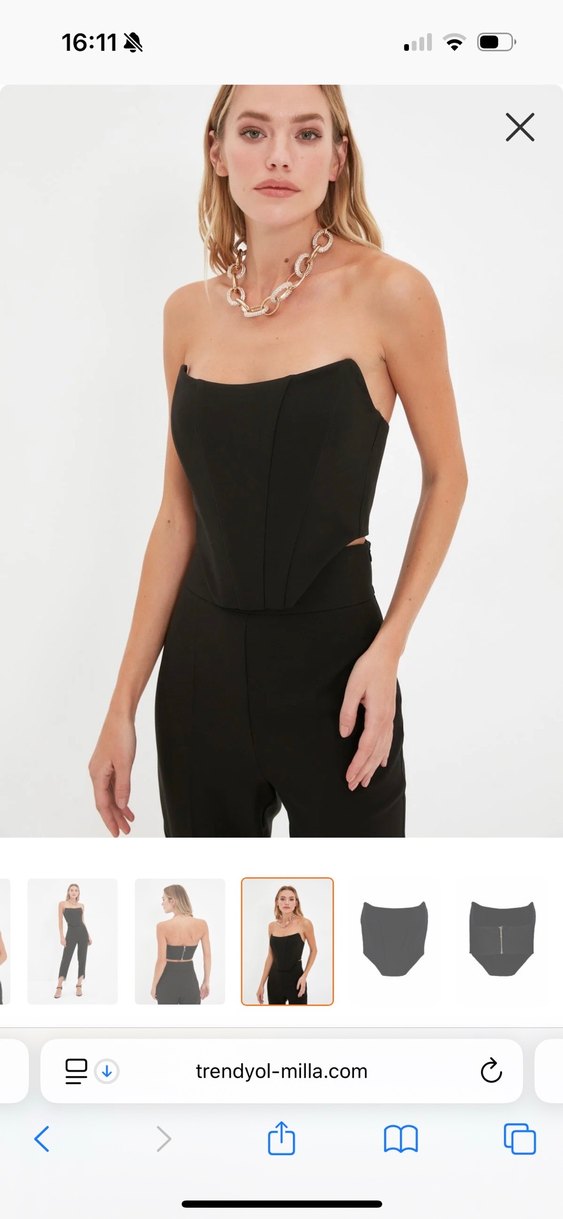 Siyah straplez mini büstiyer, düzenli kesim ve kısa boy ile. Pürüzsüz sentetik kumaştan, minimalist tasarımıyla romantik akşamlar için şık ve rahat. Bir kez foto çekilmek için giyildi