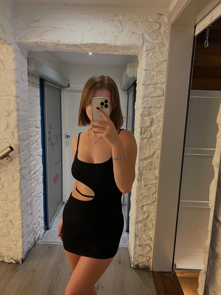 Siyah straplez, askılı mini elbise, cam gibi parlak dokuda, yan yırtmaçlı ve dar kesim. Cesur, minimal gotik tarz için uygun. S- m uyumlu