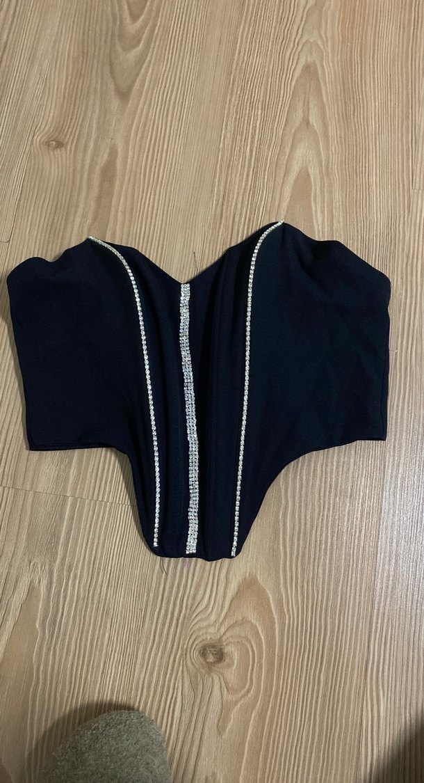 Siyah straplez göğüs korsesi, taslı dikey detaylar ve dar kesimle.Trendy ve avangart bir görünüm için uygundur. ✨