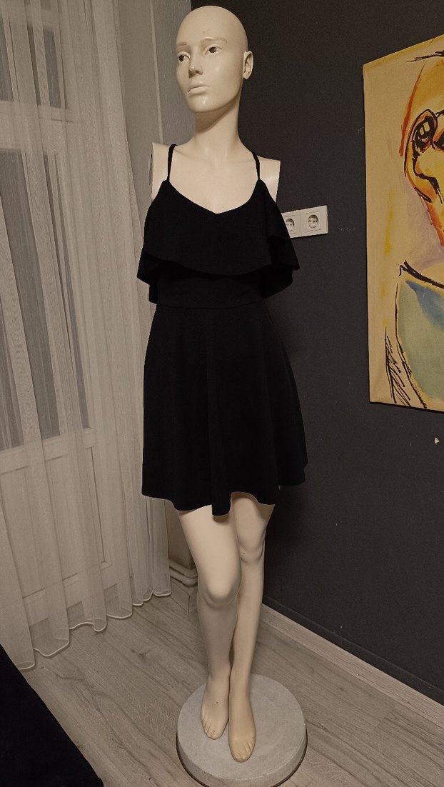 Siyah straplez mini elbise, ince askılar ve dökümlü katmanlarla rahat kesime sahiptir. Yumuşak sentetik kumaştan yapılmış, günlük kullanım için uygundur.