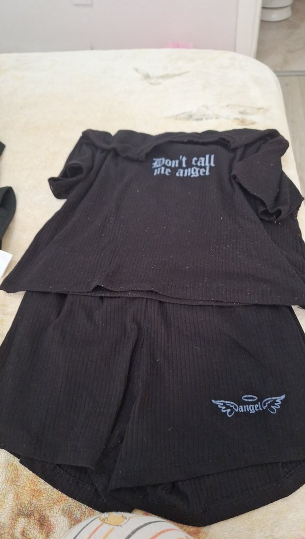 Siyah, straplez, kısa hamile gömleği. Rahat kesim, keten kumaş ve pilili detaylara sahip. Gotik tarzda, 'Don't call me angel' yazılı.