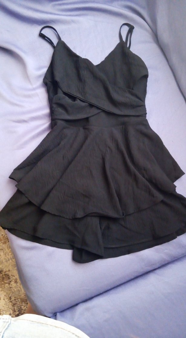 Siyah renkli, straplez yaka ve ince askılı, kat kat volan detaylı, vücuda oturan mini elbisedir.