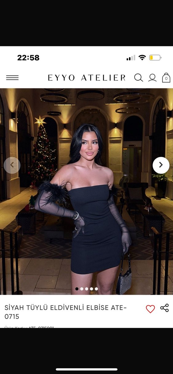 Siyah straplez mini elbise, strappy kollarda kürk detaylarıyla dikkat çeker. Cesur ve göz alıcı parti stiline uygundur.